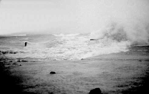 Í óveðrinu á dögunum brast flóðgarðurinn, sem veita á Þormóðseyri vörn gegn flóðahættu. Er nú mikil hætta á því að sjór flæði inn á eyrina og mundu þá hús verða í hættu. Er brimið var sem mest á dögunum flæddi inn í marga kjallara á Siglufirði og var vatnið mjög hátt í mörgum þeirra. Var mikið tjón í flóðunum. Myndin sýnir flóðgarðinn þar sem hann féll niður. J.G.M.