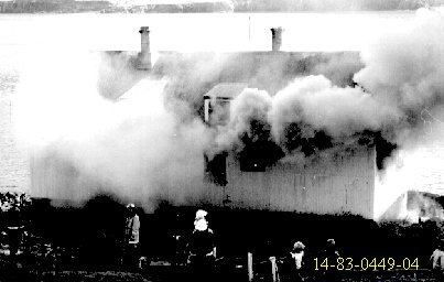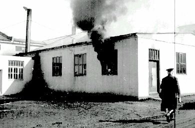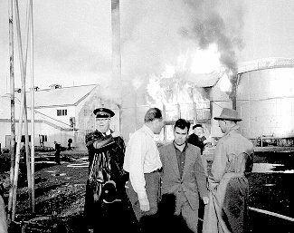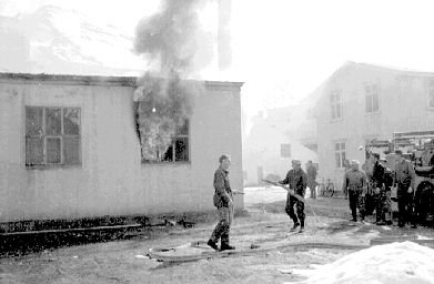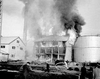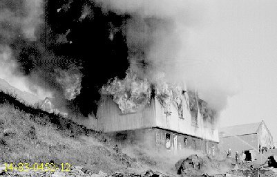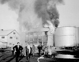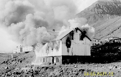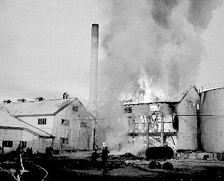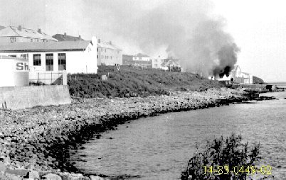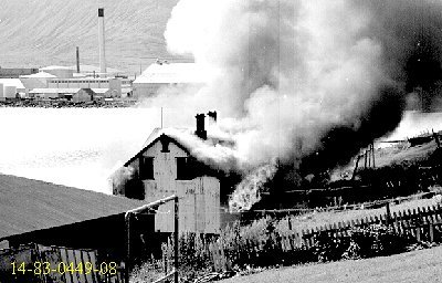 Þarna er Netastöð Síldarverksmiðja Ríkisins að brenna. Allt brann nema steyptir veggir. Síðar var húsið endurbyggt undir soðkjarnaverksmiðju. Nú er húsið notað sem geymsla, aðalega sem "eitur"geymsla. Ljósm; Kristfinnur