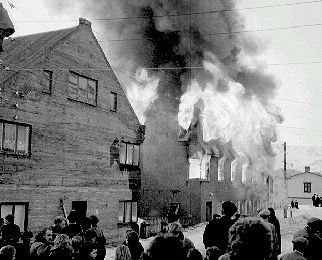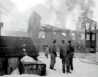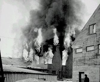 03-00-0126-21a Frá bruna "Hvíta hússins" Bæjarskrifstofu hússins og lögreglustöðvar. En í því kviknaði eftir að unnið hafði verið að því að þíða frosnar vatnslagnir við útvegg hússins, ekki var farið nógu gætilega með eld.