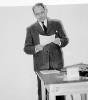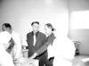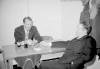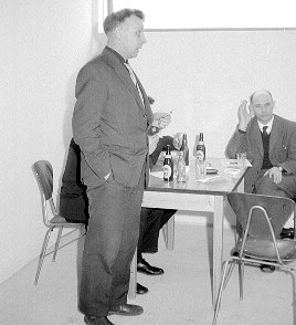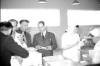 08-62-0042-12 Hér opnar Vilhjálmur Guðmundsson framkvæmdastjóri, fyrstu dósina úr framleiðslunni. Kristján Sturlaugsson kennari. situr við borðið, Halldór Guðmundsson (Frón) kaupmaður m. fleiru og Ólafur Ragnarsson síldarsaltandi og kaupmaður í bakgrunni. |