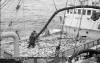 11-68-0113-27 Þarna eru skipverjar Hafarnarins að undirbúa söltun á síld, sem hífuð var um borð, þarna eru Sigurður Jónsson og Guðmundur Björnsson hásetar að moka í tunnu, en skipverjar veiðskipanna gáfu oft skipverjum Hafarnarins nokkrar tunnur af farmi sínum, sprikklandi síld sem söltuð var um borð og seld síðan Sigló Síld á Siglufirði.