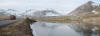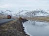 Suðurhluti Langeyrartjarnar, þar sem hólminn á að koma um 50 metra frá landi. - Lítill snjór er eftir í fjöllunum, - en þó miklu meir en nægur snjór á skíðasvæðinu í Skarðdal, eins og sést á þessari mynd.