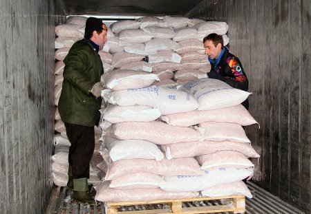 frystigámi að koma rækjupokum á bretti, en rækjan er unnin í verksmiðju