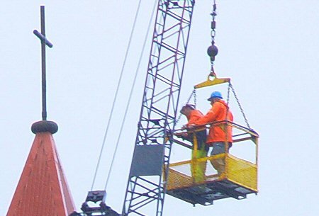 sjálfur og Birgir Ingimarsson, hífaðir upp að krossi kirkjuturnsins, en