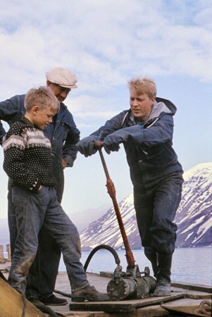 Ísaksson og Páll Hlöðversson. Páll er þarna með handknúna loftdælu í gangi,