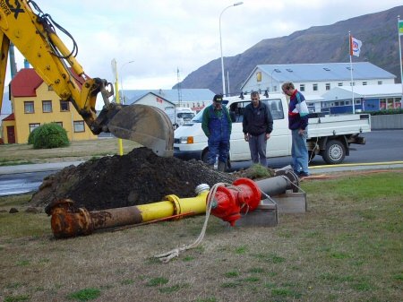 Skipt um brunahana. Þarna eru bæjarstarfsmenn að skipta um