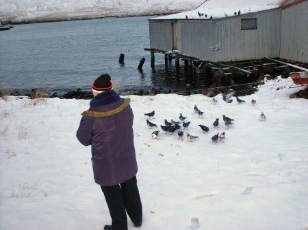 framan við Síldarminjasafnið, í þeim tilgangi að gefa 40-50 dúfum sem