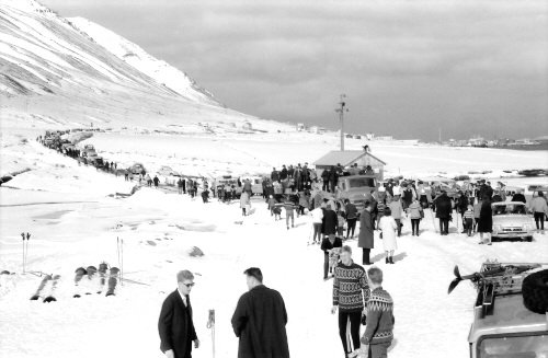 1964. Myndin er tekin eftir að skíðamóti lauk- og áhorfendur lögðu af