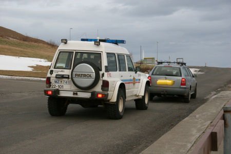 lögreglubílinn á myndinni til vinstri. Sennilega fyrir of hraðan akstur.