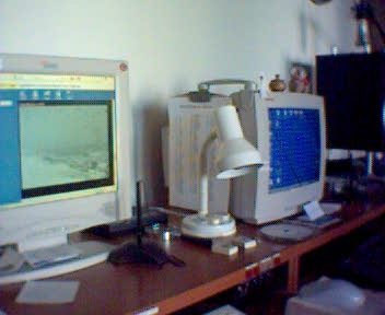 Þarna á Kalli við að önnur tölvan er með mynd frá vefmyndavélinni hjá