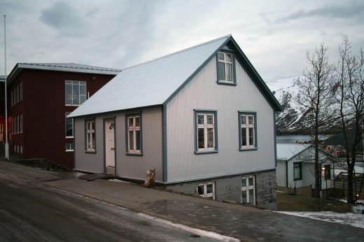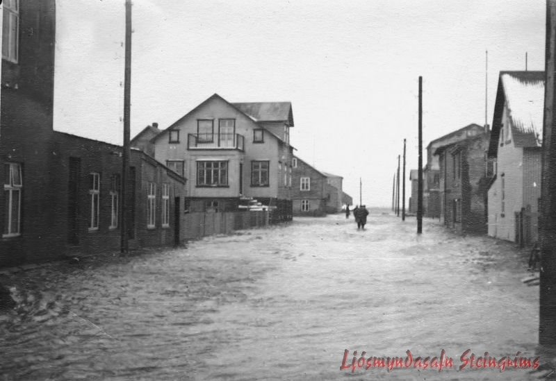 sést "Ytra húsið" og Póst og símahúsið hinum megin við götuna-