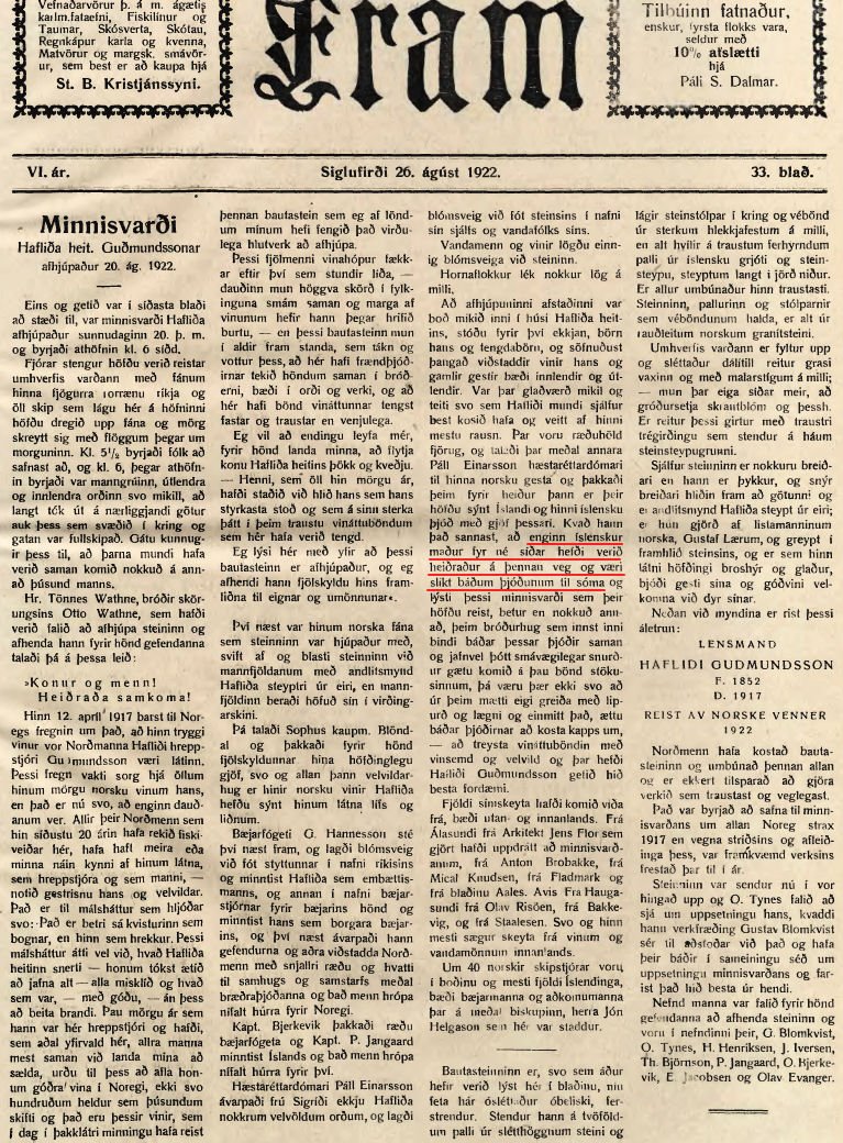 | Ljósmynd af grein úr blaðinu FRAM árið 1922 |