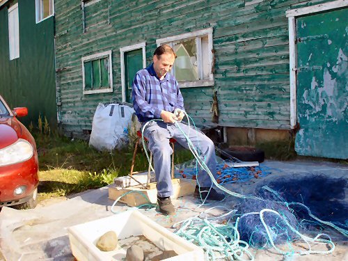 17. júlí Jóhannes Arelakis, eða Jannis (fb.Janus) eins allir kalla hann, situr hér í sólinni og hitanum og er að dytta að grásleppunetum til að gera þau klár fyrir næstu vertíð.