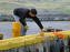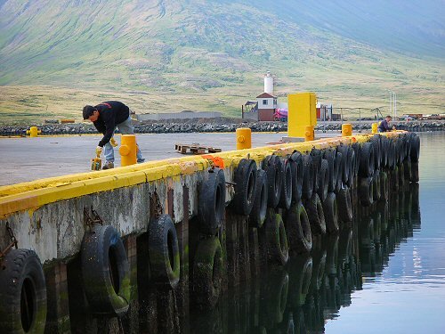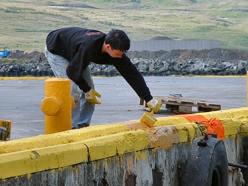 18. júlí- 08:55 Unglingarnir koma víða við, þarna eru tveir þeirra að vinna að snyrtingu Ingvarsbryggju, og mála kantinn viðeigandi litum, gulu og orange. Sólinn hátt á lofti, 15 stiga hiti og logn.