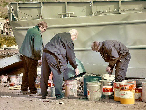18. júlí- 09:55 Þarna eru bræðurnir Stefán Einarsson og Hjalti Einarsson, ásamt Stefáni Sævar, syni Stefáns, að blanda málningu, til undirbúnings að mála flutningapramma sem Hjalti á.