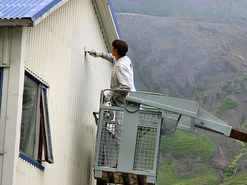 Málningarvinna við hús var í framkvæmd á nokkrum stöðum í bænum. Þarna er Mark Duffield að störfum við hús í Aðalgötunni.