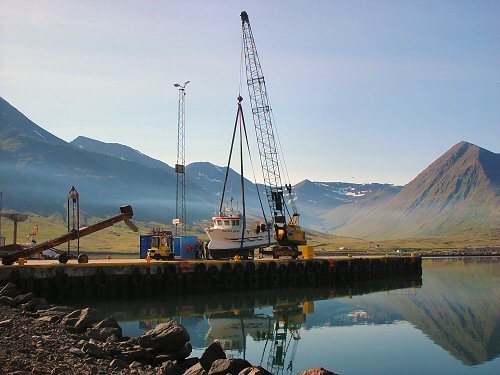 16. júlí 09:20 Það var líf við höfnina á Sigló í morgun, ekki bar þó á löndunum á afla, nema hjá S.V. þar sem Norska skipið Krossfjörd var að landa loðnu. En verið var að dytta að nokkrum smærri bátum, þarna var verið að hífa bátinn Heddi frændi EA-23 á þurrt.