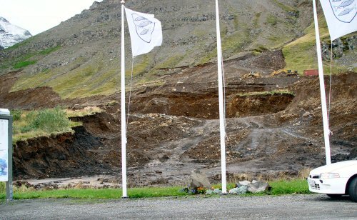 19. september Hvanneyraráin. Það var skrítin tilfinning að sjá Hvanneyrarána, eins og sést á myndinni. Mér var bent á þetta áðan (11:15) en búið er að "stífla" ána, þannig að stórgrýti var komið fyrir fyrst, sem áin rennur á milli, og síðan gerður vegur yfir, til að vinnuvélar og fleira kæmist yfir á Hvanneyrarskálarveginn, vegna framkvæmdanna þar og við væntanlega snjóvarnargarða. Þetta er gert til að hlífa Hólaveginum fyrir þungaakstri, sem nauðsynlegur er vegna framkvæmdanna. En mér dettur í hug: Hvernig mun þessari "stíflu" vegna í vor þegar áin er í vexti, kemst allur flaumurinn um stórgrýtið, eða flæðir yfir? Ég hefi grun um að, garðurinn standist ekki vorleysingarnar, og dæmi er um að haustrigningarnar hafi valdið, ekki minna flæði í ánni en oft á vorin. Sver rör ca. 2 m í þvermál, hefði verið æskilegra, en nóg er af slíkum "aflaga rörum" í firðinum, sem hefði mátt nota.