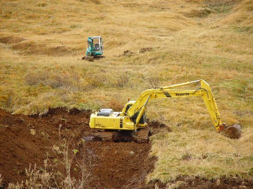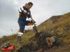 Starfsmenn Rarik-Hitaveitu á Siglufirði, uppi í hlíðinni sunnan Hvanneyrarár. En þarna er Árni Skarphéðinsson að sjóða flansa á rör, til að koma á loka, en þessi 6" lögn tók upp á því að leka og þarfnaðist viðhalds, Þetta er kælivatnslögn fyrir ljósavélarnar á vara rafstöðinni. Óli Agnarsson fylgist með.