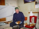 15. janúar 2004 Þetta er hann Velli, eins og allir kalla hann Sverrir Björnsson, skipstjóri og útgerðarmaður, hákarlaveiðimaður og verkandi. Ég heimsótti hann í morgun í "Sunnubraggann" þar sem hann hefur aðstöðu, þar var hann var að yfirfara og skoða hákarlabeitur sem hann hefur verkað. Hann aflaði á síðasta ári um 30 hákarla, tók sjálfur til