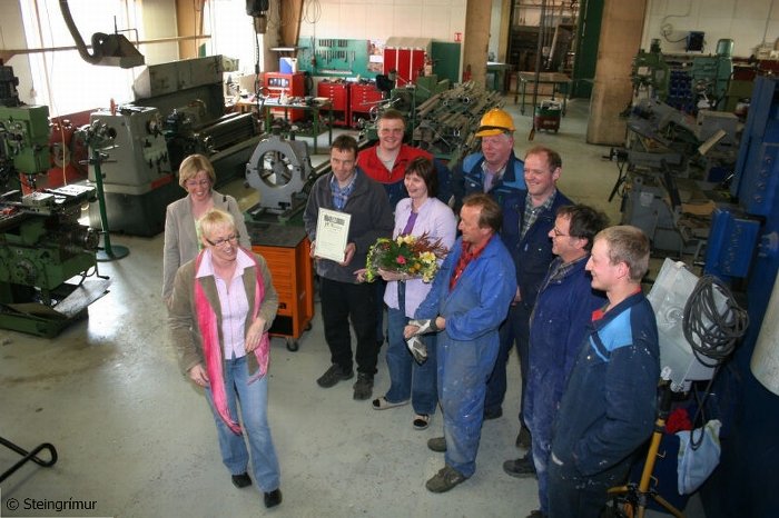 Við afhendingu viðurkenningarinnar; fyrirtæki mánaðarins í júní 2005: Helga Freysdóttir og Elín Þór Björnsdóttir nýbúnar að afhenda Guðna og Pálu viðurkenninguna