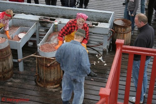 Síldarmerki komið fyrir í stígvéli síldarstúlku