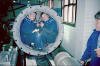 03-96-0481-20 Þarna eru Hjörtur Elefsen og Elvar Elefsen, inni í "verkefni" sem fest er í stóra rennibekkinn á Vélaverkstæði SR á Siglufirði. Verkstjórinn Óskar Elefsen horfir á.
