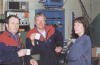 29-02-0265-01 - (2002) Milos Hahod, Guðmundur Skúlason, Rikharður Jónsson og Heiðmundur Clausen, fyrir aftan. - Þessir garpar frá Suðurnesjunum, voru fengnir til rafsuðuverka við tankabotn og þak, ásamt heimamönnum.