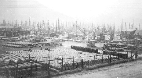 af tunnuskipi að losa tómar síldartunnur á Hafnarbryggjuna. tekin af