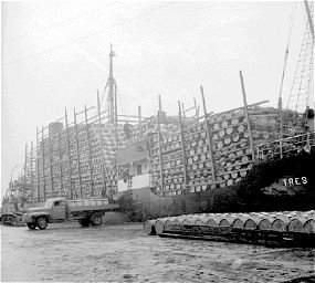 Þessi mynd er af tunnuskipi að losa tómar síldartunnur á