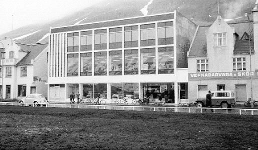 K.F.S. opnaði hið nýja og glæsilega verslunarhús sitt hinn 26. maí sl. Húsið er þrjár hæðir, að rúm-máli 364 rúmmetrar og gólfflötur neðstu hæðar um 400 fermetrar, búið mjög fullkomnum inn-réttingum af sænskri gerð. Á neðstu hæð er mat-vörukjörbúð, á annarri hæð vefnaðar, fata- og skóbúð, einnig með kjörbúðarsniði, en þriðja hæð, sem á að hýsa skrifstofur o.fl., er enn ófullgerð.
