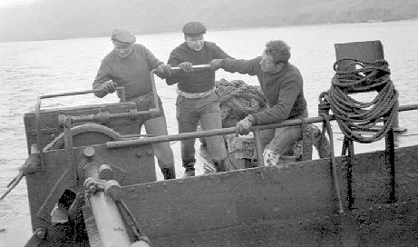Á prammanum eru þrír menn (sem fara á milli prammana eftir þörfum) og hefst nú þeirra puð fyrir alvöru. Þeir leggjast á sveif og byrja að snúa nei þeir eru ekki að snúa .vél í gang, það er enginn vél um borð, heldur þrír menn sem snúa og snúa þungu handsnúnu "spili", fyrst tveir í einu á einni sveif sá þriðji hagræðir vírnum með sleggju.
