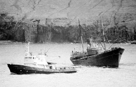 Þessi mynd sýnir er togarinn Hafliði frá Siglufirði lagði upp í sína síðustu ferð frá Siglufirði 9. júní sl. dreginn af dráttarbátnum Goðinn.