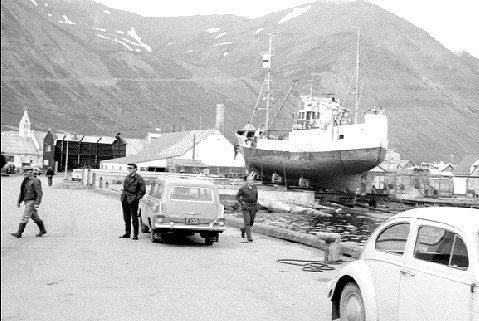 Hér sjáum við norska hvalfangarann Milöy í slipp á Siglufirði. Viðgerð á skipinu er nú lokið og hélt það út í fyrradag.