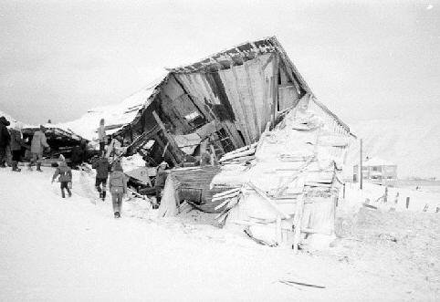 Myndin sýnir rústir hænsnabús sem snjóflóð olli, er féll við suðurjaðar Siglufjarðarkaupstaðar og tók með sér barnaleikskóla og hænsnabú, en aðeins munaði þremur metrum, að flóðið lenti á íbúðarhúsi, þar sem búa hjón með tvö börn.