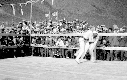 27-00-0109-02 Glíma á danspallinum á Ţjóđhátíđ í Herjólfsda. Ljósmynd: um 1930 Gísli Halldórsson |