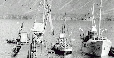 00-00-0253-00 Botna Myndin er af þeim f.v. Stefáni Hannessyni Utan-verðunesi, Árna Magnús-syni, bróður Jóns Ósmanns ferjumanns, Þórði Gunnarssyni á Lóni og loks Jóni Ósmann ferjumanni sem stendur við vinduna. Jón er að ferja þá yfir vesturós Héraðsvatna á Botnu eldri. Í baksýn er byrgi Jóns sem hann kallaði á Furðuströndum. Myndin er tekin um 1903 en mér er ekki kunnugt um hver er ljósmyndari. Það gæti þó verið Daníel Davíðsson ljósmyndari á Sauðárkróki. |