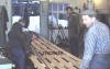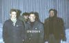 Guðmundur Jóhannesson, Ásgeir Björnsson, Jón Kr Jónsson og Óskar Garðarsson við sleða sem notaður var undir járnavirki vegna bryggjusmíði