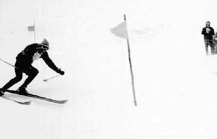 - sigraði í svigi og stórsvigi og alpatvíkeppni. - Næstu myndir eru af fremstu mönnum í stórsvigi. - Efri myndin er af Jóhanni
