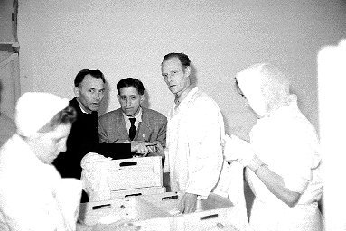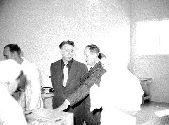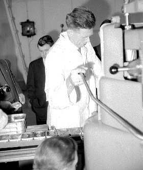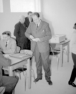 Hér er fylgst með lokunarvélinni, Sigurjón Sæmundsson bæjarstjóri til