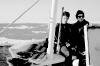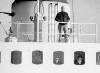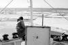 11-68-0037-15 Britinn Sverrir Torfason litast um í kvöldsólinni, ippi á brúarþaki, í brúarglugga til vinstri er Bergveinn Gíslason loftskeytamaður og til hægri, Sigurður Þorsteinsson skipstjóri