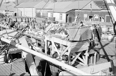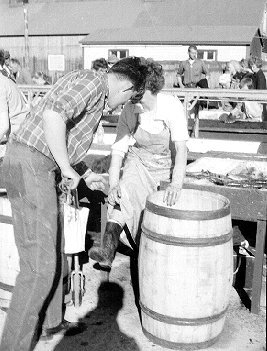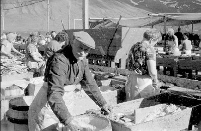Þarna tekur síldarstúlkan við "kvittun" fyrir saltaða tunnu,