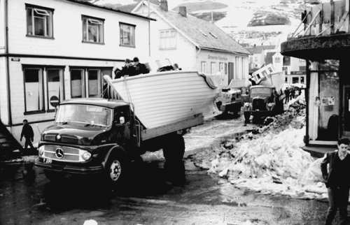 Það þykir í frásögu færandi, að ofan Hólavegar, sem er efsta gatan á Siglufirði, eða í fjallshlíðinni ofan við kaupstaðinn, er lítil "skipasmíðastöð", sem fræg er fyrir trillubátasmíði. Það kunna að vera aðrar skipasmíðar í fjöllum, um þær er okkur ókunnugt. Morgunblaðið lét ljósmyndara sinn fylgjast með ferðalagi tveggja trillubáta um götur Siglufjarðar, sem leið liggur á nýju hafnarbryggjuna þar sem þeir voru sjósettir. Á stærstu myndinni eru tvær trillur "komnar á bak" Benzinum og halda á farkosti sínum niður Aðalgötuna. Til vinstri sjást skrifstofur Haraldar Böðvarssonar og & Co, og Norska sjómanna- heimilið, en til hægri (eins og vera ber) afgreiðsla Morgunblaðsins á Siglufirði, sem er til húsa í Aðalbúðinni. Á næstu mynd eru trillurnar komnar niður á Hafnarbryggju ásamt forvitnum áhorfendum, og þar kemur "kraninn" til sögunnar, hefur þær áloft og