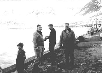 skilar þeim síðan á sjóinn, þann er þær skulu sigla um og sækja björg í bú, Siglfirðinga og þjóðarheildar- innar. Loks er hér mynd af skipasmiðnum sjálfum, og eiganda Sæfara, Sæmundi Jónssyni, og eigendum Öldunnar, þeim Guðlaugi og Henning Henriksen, sem eru síldar-saltendur og framkvæmda-menn á fleiri sviðum. Hjá þeim stendur fulltrúi framtíðarinnar, ungur drengur sem horfir á sjó út og nýja bátinn.