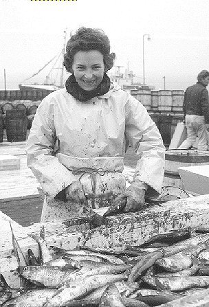 síldarstúlka í fyrstu síldinni á Siglufirði.