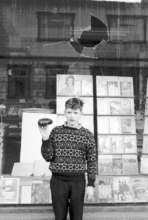 braut stćđar gat á stóran sýningarglugga Bókaverslunar Lárusar