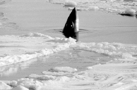 Hrefna stingur höfðinu upp úr einni vökinni milli hafísjakanna fyrir norðan