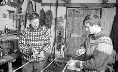 Þeir voru að „setja upp" grásleppunet, þegar ég birtist, og var auðséð, að það lá vel á þeim, enda ungir menn og bjartsýnir. Er ég spurði þá frétta, brostu þeir og sögðust hafa frá nógu að segja, hvað vildi ég bara vita. Þeir sögðust meðal annars vera búnir að vinna öllum stundum við undirbúning komandi vertíðar, allt frá vertíðarlok um i fyrra, og væru á lokasprettinum. Dæmi mun um að bátar héðan séu með yfir 100 net, en uppsett netaslanga, 45 faðma, mun kosta um kr. 2.500.00 en allir trillukarlarnir hér skapa sér vinnu með því að „setja upp" net sín sjálfir, og nota til þess tíma, þegar ekki gefur á sjó.