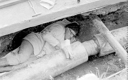 Vinnuaðstæður ekki upp á Það besta. Ægir Jónsson lagfærir „nálaraugaleka". Ljósmynd: Steingrímur |