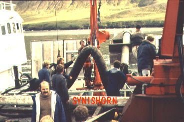 Löndun; Unnið að tilrauna dælingu úr síldarflutningaskipi. Geir Zoega